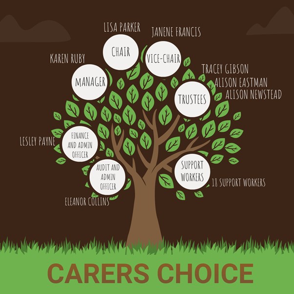 We are a Charity, so that means we are governed by a Board of Trustees or a Committee. Our Committee approves or denies all financial decisions. Management over sees the daily running’s of the charity, and the Committee ensures they are following the values of the charity. At Carers Choice we have a Board of Trustees, a Manager, a Finance and Administration Officer, a Audit and Administration Officer and a team of Support Workers to ensure the smooth and effective running of our amazing Charity. Below is a framework of how our team works!