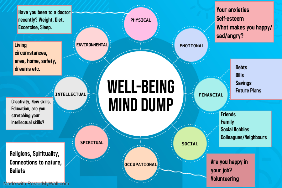 Hopefully even if your overall well-being is not great right now, you should feel more in control of how to fix it. Make sure to tailor these mind dumps towards you, if you need to focus on just one or two dimensions, do that. Do these regularly to compare your progress.